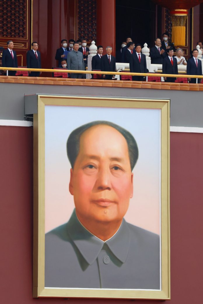 O presidente Xi Jinping (de cinza), o ex-presidente Hu Jintao e outros líderes se reúnem acima do retrato gigante de Mao Zedong, na Praça Tiananmen (da Paz Celestial), durante o evento que marca o 100º aniversário de fundação do Partido Comunista chinês, em Pequim, em 1º de julho de 2021