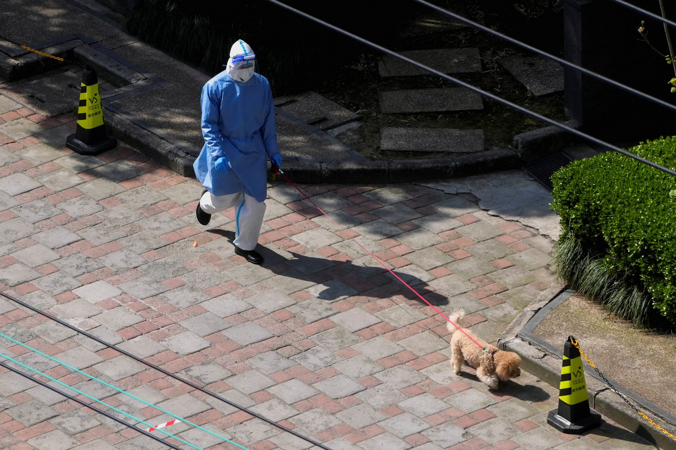 Em 24 horas, houve mais de 13 mil casos no país, que vive surto da ômicron. Em Xangai, epicentro dos casos, 25 milhões de pessoas estão em confinamento. Em roupa de proteção especial, homem passeia com cachorro em rua de Xangai, onde 25 milhões de pessoas estão confinadas
