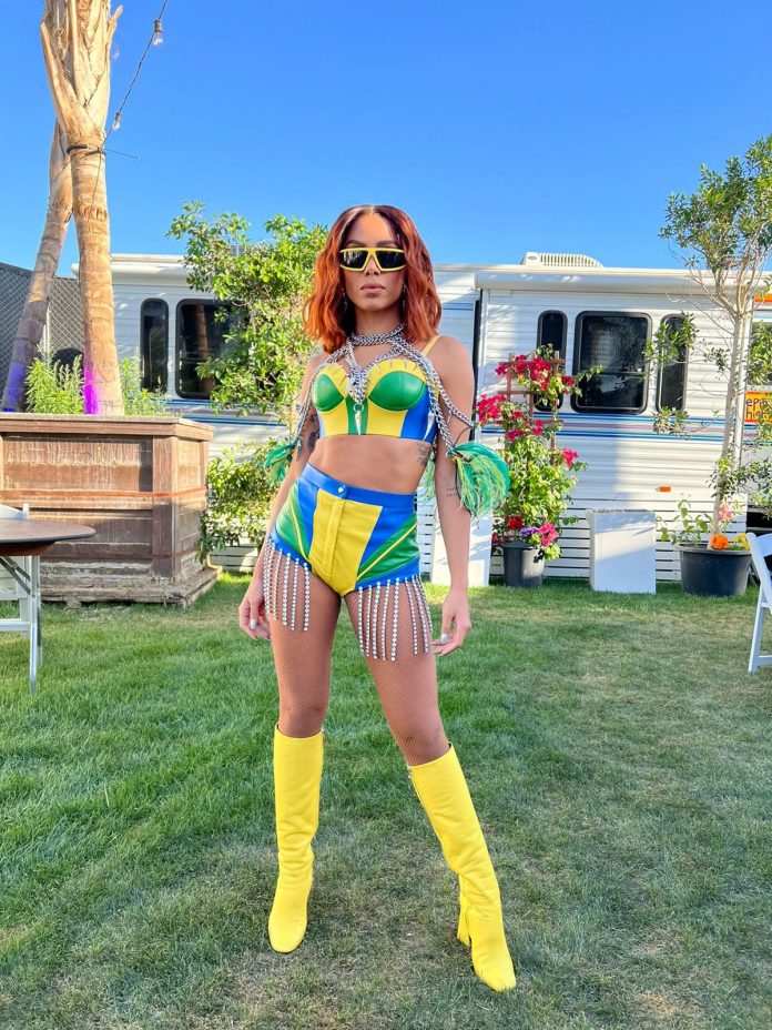 Tendência da vez foi o uso do couro, amarrações, correntes e a dupla clássica da moda e queridinha dos famosos, preto e jeans Anitta chega ao festiva Coachella. Ela usou esta roupa no início do show