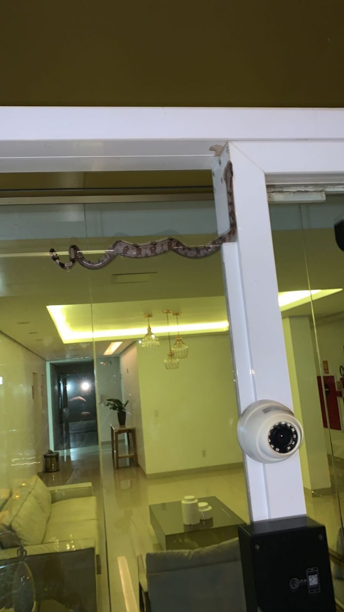 Uma visita inesperada assustou moradores de um condomínio no centro de Palmas, na noite desta segunda-feira (26). A jiboia apareceu na porta de vidro que dá acesso ao prédio.