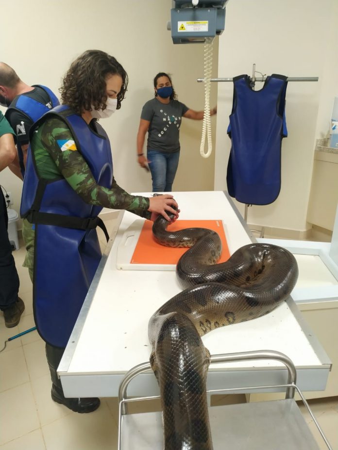 Uma cobra sucuri foi resgatada pelo Batalhão Ambiental da Polícia Militar, nesta quinta-feira (14), após cair de uma cachoeira no distrito de Taquaruçu Grande, na zona rural de Palmas. A serpente passou por um exame de raio-x que constatou uma fratura abaixo da cabeça.