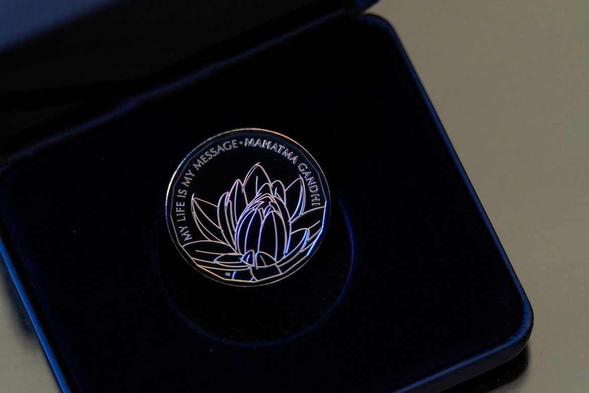 Sobre elas, foi cunhado um lótus, a flor nacional indiana, junto a uma citação de Gandhi: “minha vida é minha mensagem”.