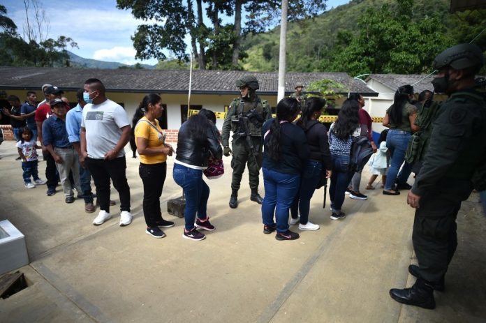 Eleitores escolhem a nova composição do Congresso e os candidatos que disputarão a eleição para presidente, no final de maio. Candidato de esquerda é o atual favorito nas pesquisas. Voto no país é facultativo. Fila de eleitores na Colômbia em foto de 13 de março de 2022