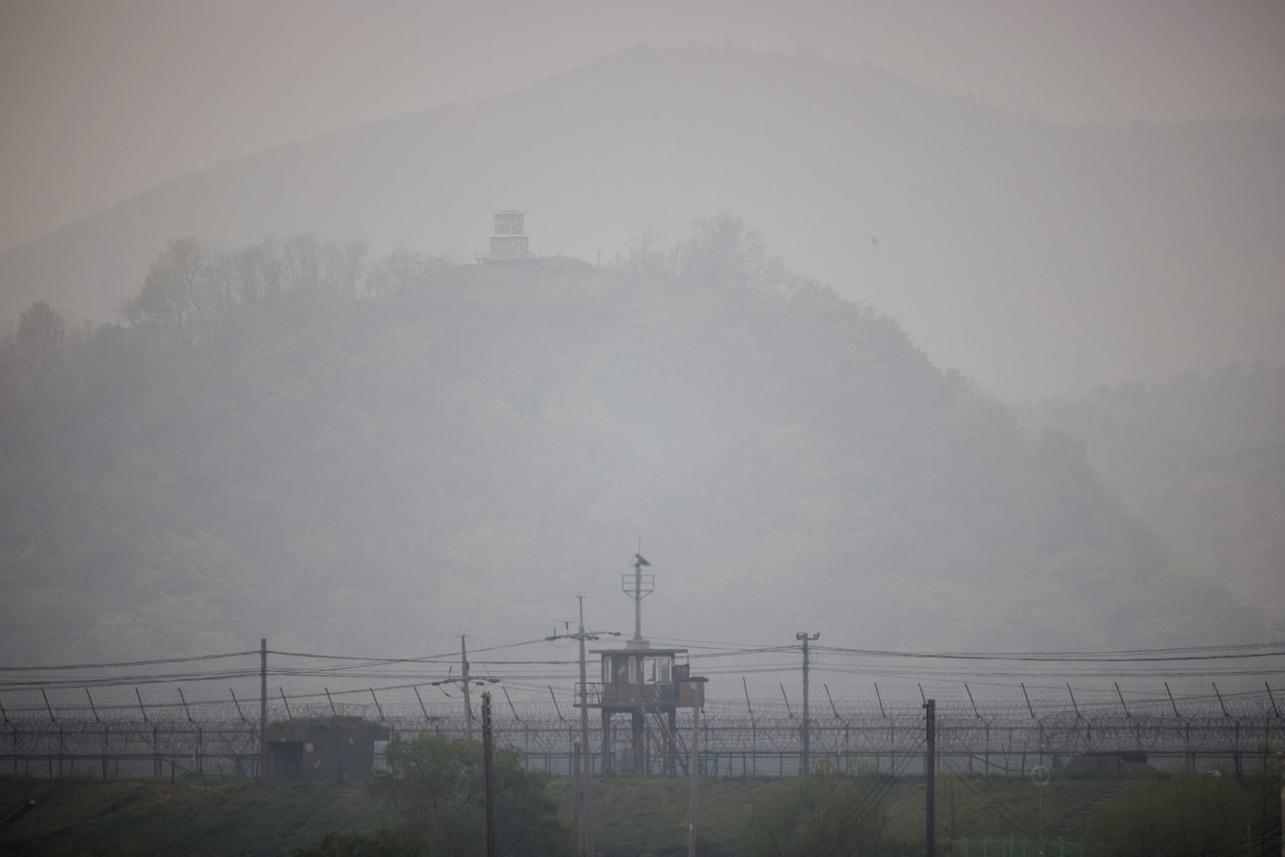 Parada militar, com drones, fogos de artifícios e mísseis, é vista como tentativa de Kim Jong-un de mostrar poder bélico. Em março, Pyongyang testou lançamento de míssil balístico internacional. Postos de controle da Coreia do Sul, à frente, e da Coreia do Norte, ao fundo, horas antes da parada militar em Pyongyang nesta segunda-feira (25)