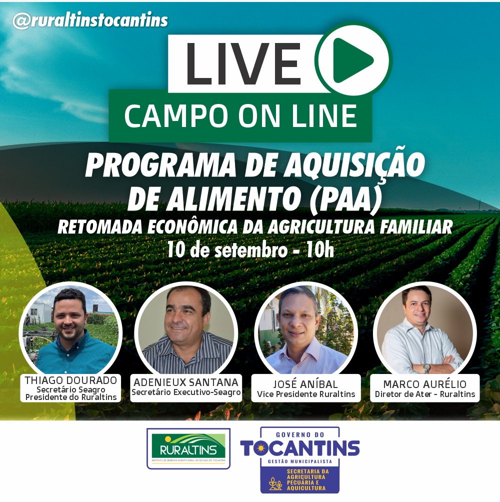 Reforçando mais uma importante ação do governo para fortalecer a agricultura familiar durante a pandemia do novo coronavírus, o Governo do Tocantins, por meio do Instituto de Desenvolvimento Rural do Tocantins (Ruraltins), dá início ao Programa de Aquisição de Alimentos (PAA), na modalidade Compra Direta. O lançamento do programa ocorrerá nesta quinta-feira, 10, às 10 horas, com a Live Campo on-line, via Instagram (@ruraltinstocantins).