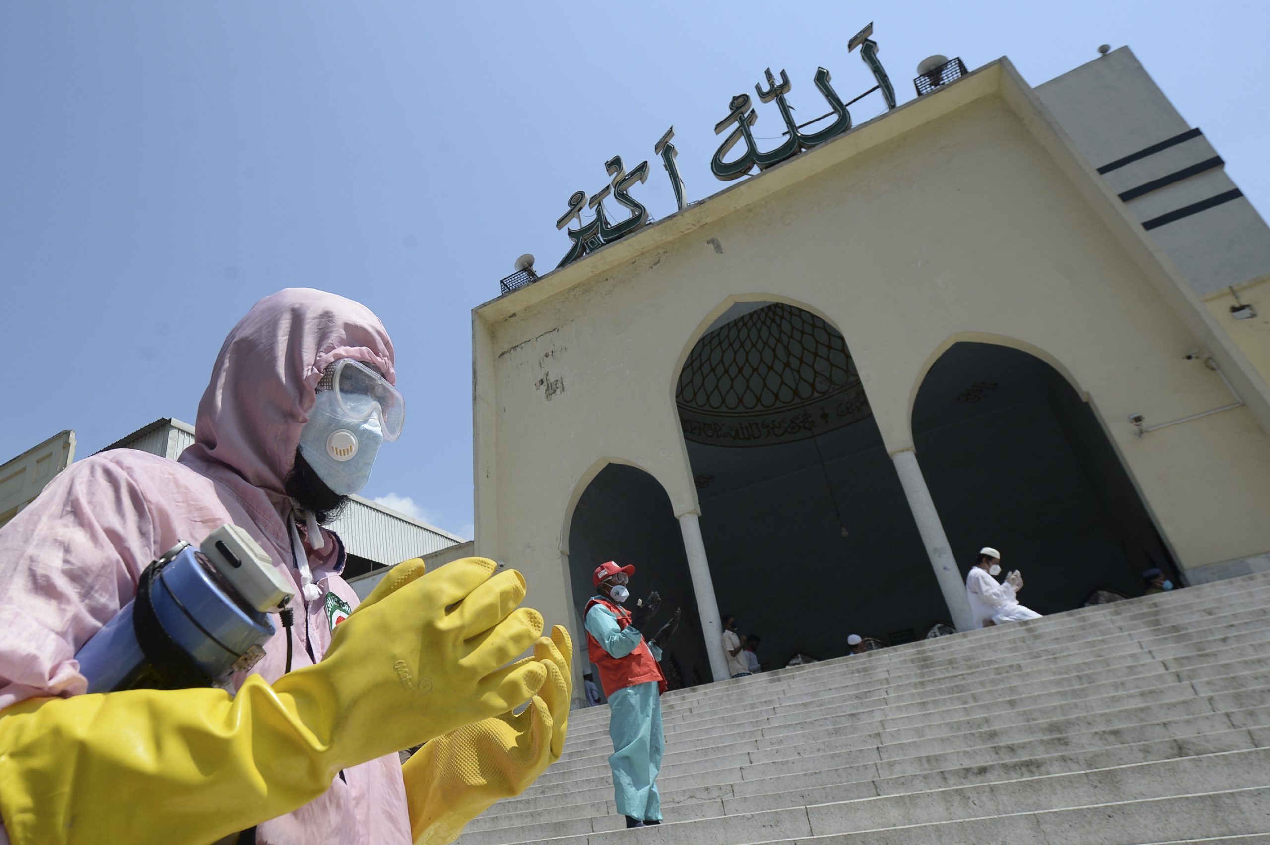 Governo impôs confinamento estrito para tentar conter a contaminação. A cidade de Khulna sofre um colapso na saúde com a chegada da variante delta do coronavírus. 8 de maio: muçulmanos com roupas protetoras contra o coronavírus rezam em frente à Mesquita Nacional Baitul Mukarram, em Bangladesh