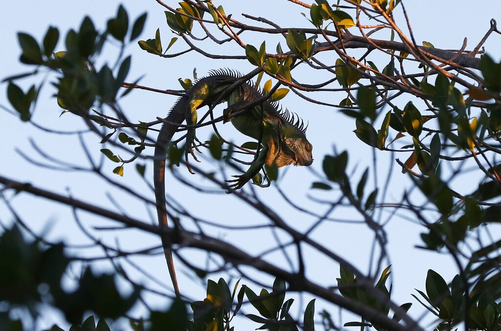 Animais entram em uma condição letárgica sob baixas temperaturas e despencam, mas costumam se recuperar com os primeiros raios de sol. Iguana pendurada em árvore na Flórida, EUA em 30 de janeiro de 2022