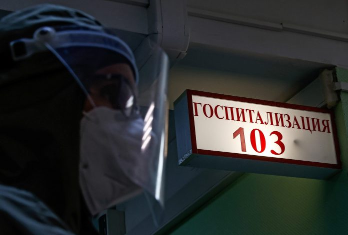 Países como Rússia, Polônia, Ucrânia e Bulgária enfrentam resistência da população à vacina e estão entre os europeus com as menores taxas de imunização. Em meio à alta nos casos, governos reimpõem restrições. Medico paramentado em frente a hospital em Moscou, Rússia, que atende a pacientes de Covid-19, nesta quinta-feira (21)