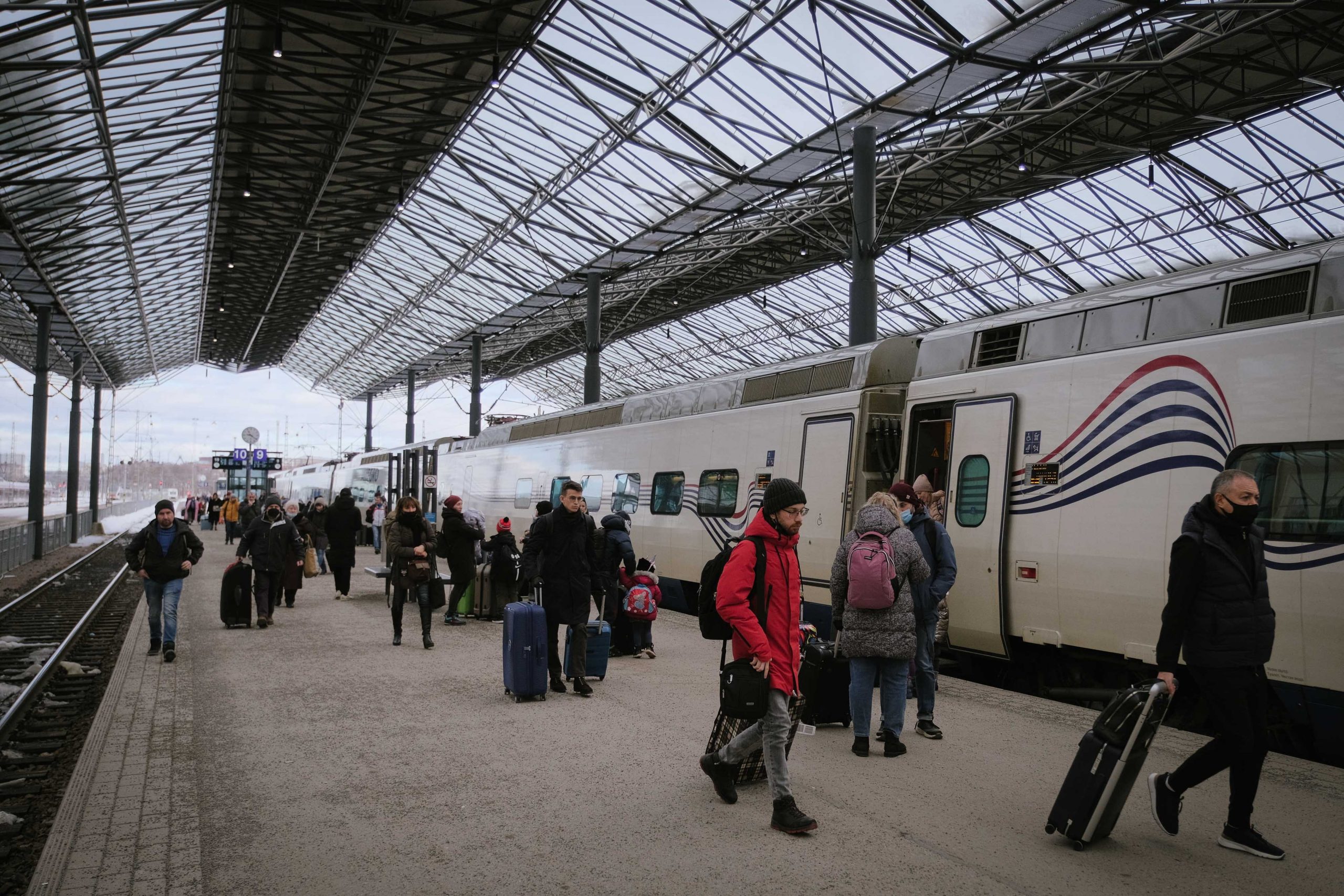 Depois que a guerra começou, muitos russos que têm possibilidade de morar na Europa Ocidental resolveram sair para não viver as consequências do conflito. Passageiros desembarcam do trem Allegro, em Helsinque, oriundo de São Petersburgo