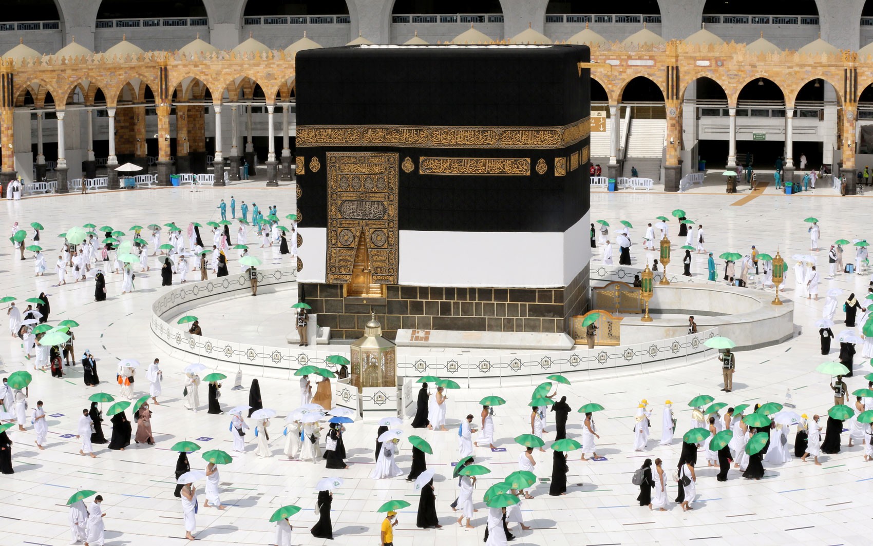 O canal de notícias Al Ekhbariya mostrou imagens de trabalhadores desinfetando a área da Grande Mesquita ao redor da Kaaba, o ponto focal do Islã, em antecipação aos rituais.