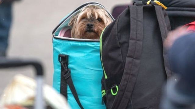 A Rádio 1 Newsbeat, do Reino Unido, consultou organizações que prestam apoio aos animais na Ucrânia Cachorro é transportado pelos donos dentro de mochila
