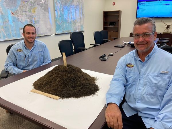 Agentes do controle de pragas da Flórida ao lado de pilha com milhões de insetos