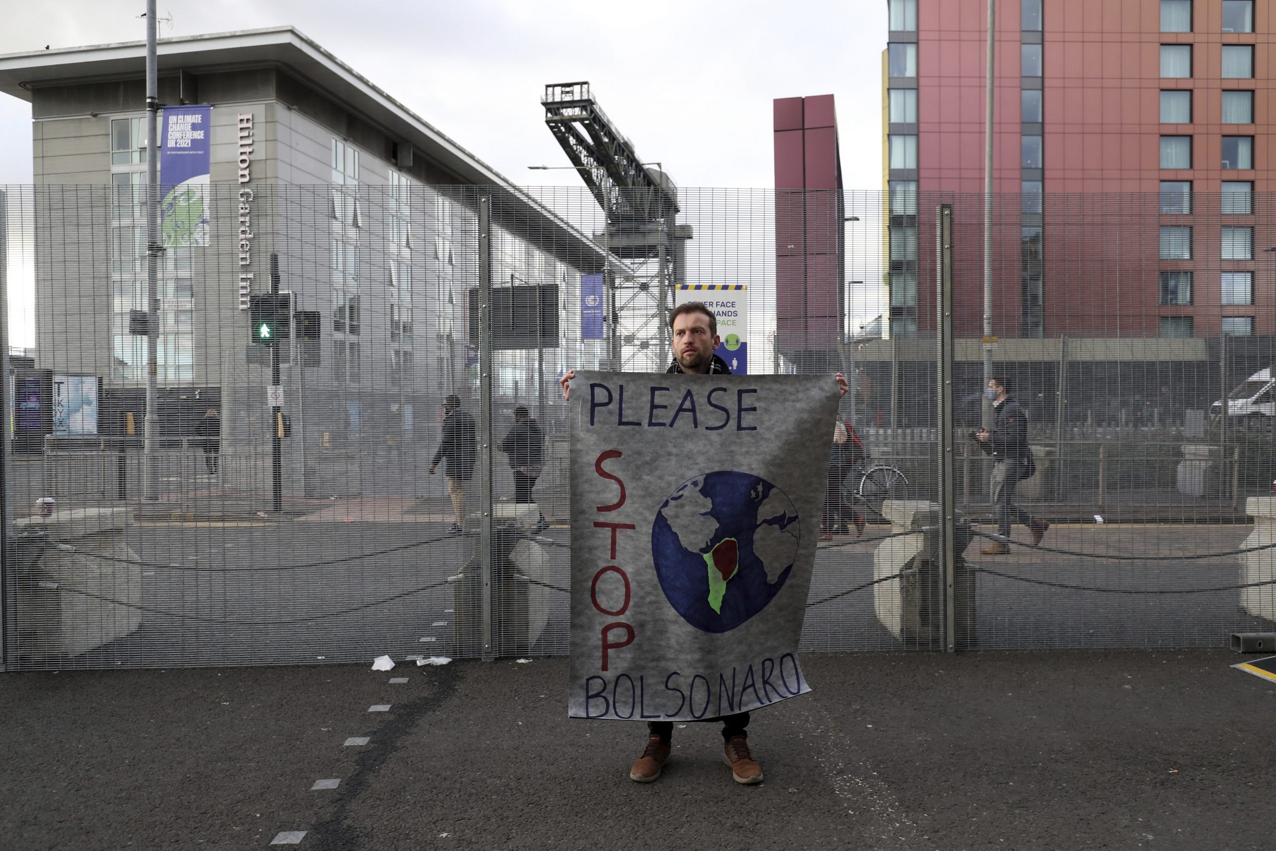 Manifestante segura cartaz contra o presidente brasileiro, Jair Bolsonaro, em protesto em Glasgow, na Escócia, no dia 2 de novembro.