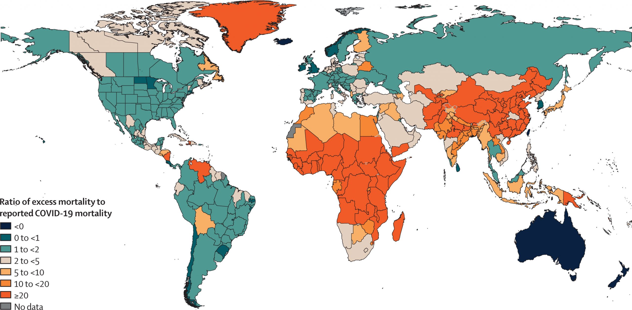 Estudo foi publicado na revista ‘The Lancet’. Se os dados forem confirmados, a doença será uma das principais causas de mortalidade no mundo em 2020 e 2021. Distribuição global da razão entre a taxa de mortalidade excessiva estimada devido à pandemia de COVID-19 e a taxa de mortalidade relatada por COVID-19, para o período cumulativo 2020-21