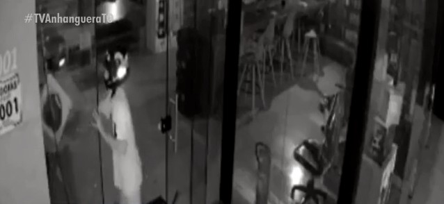 O crime aconteceu pouco depois da meia-noite. As imagens mostram que os criminosos chegaram em uma moto e pararam o veículo no meio da rua. Um dos suspeitos desceu, tirou um martelo dos bolsos e quebrou a porta de vidro.