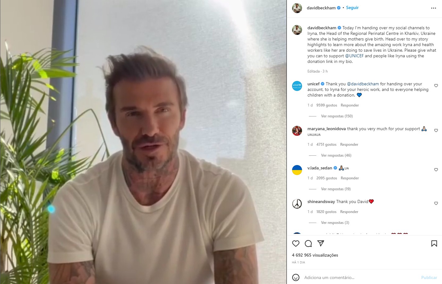 Beckham, embaixador da boa vontade do Fundo das Nações Unidas para a Infância, Unicef, postou uma mensagem em vídeo e pediu a seus seguidores que apoiem o trabalho da organização na Ucrânia.
