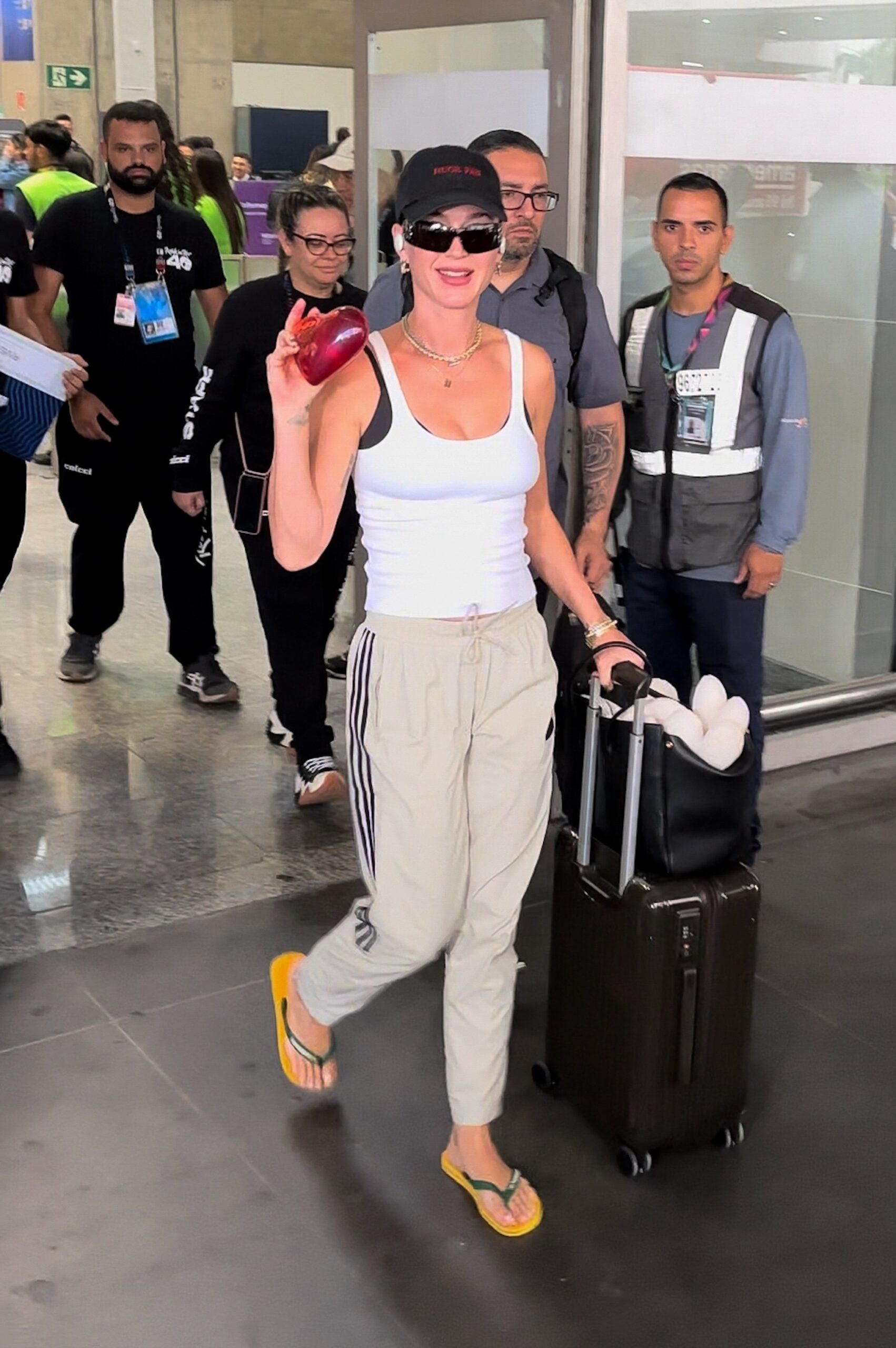 Estela da próxima sexta-feira (20) no Rock in Rio, Katy Perry chegou ao Rio nesta terça-feira (17). A cantora americana desembarcou pela manhã no Galeão usando chinelos verde e amarelos.