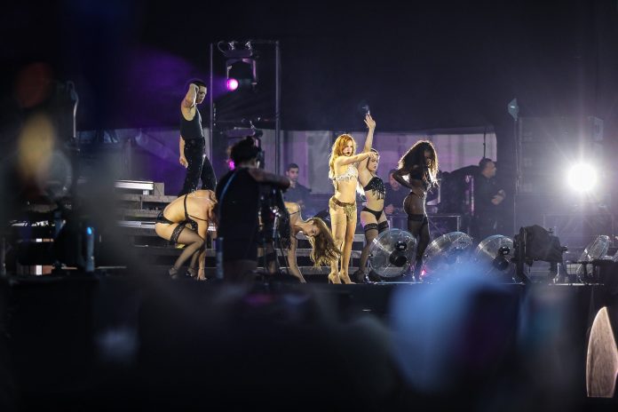 Se estava tímida, não pareceu. A cantora entrou ao som de “Fame is a Gun”, de casaco e peruca, e logo tirou – revelando que usava pouco mais que uma lingerie brilhante. Em seguida, engatou um rebolado ao som de um remix funk.