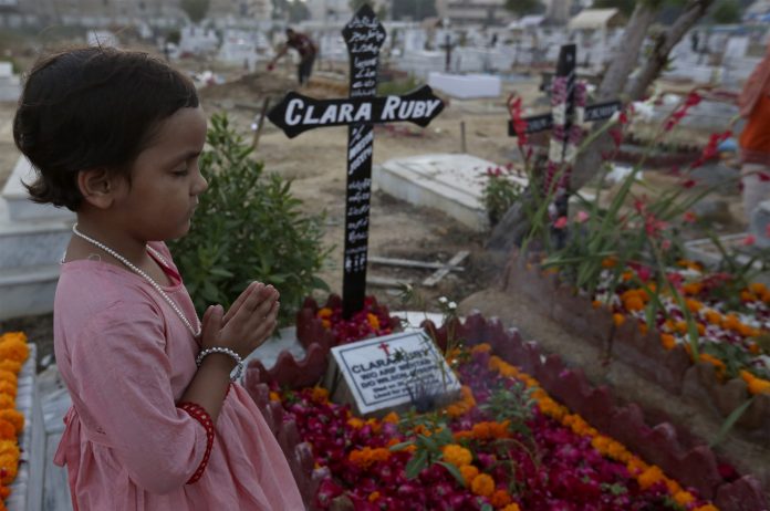 Homenagens, festejos e protestos marcaram o Dia dos Mortos nesta segunda (1º) e terça (2) em diversos países. Menina ora ao lado do túmulo de um membro da família no Dia de Finados, em Karachi, Paquistão, nesta terça-feira (2)