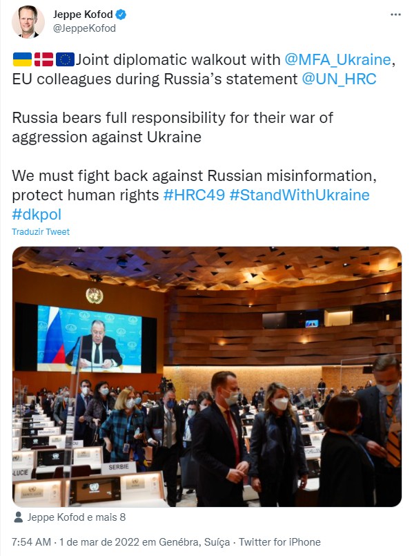 Tuíte de Jeppe Kofod sobre episódio na Conferência sobre Desarmamento da ONU, nesta terça (1º)