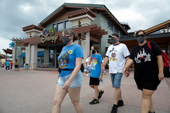 Parque disse, no entanto, que o uso de máscaras seguirá obrigatório em certos ambientes internos, como nos equipamentos de transportes. Visitantes do Walt Disney World em Lake Buena