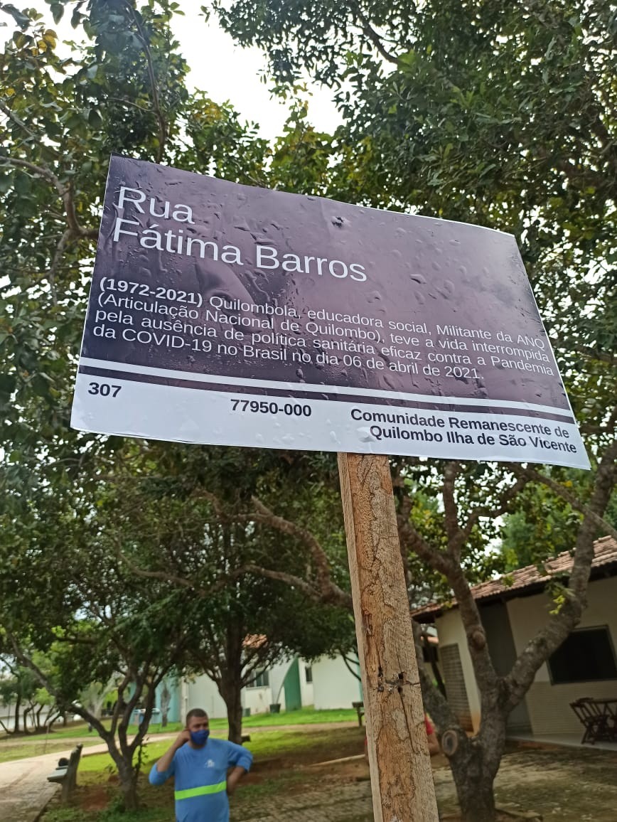 “Rua Fátima Barros – Quilombola, educadora social, militante da ANQ (Articulação Nacional de Quilombo), teve a vida interrompida pela ausência de política sanitária eficaz contra a pandemia da Covid-19 no Brasil no dia 06 de abril de 2021”, informa a placa.