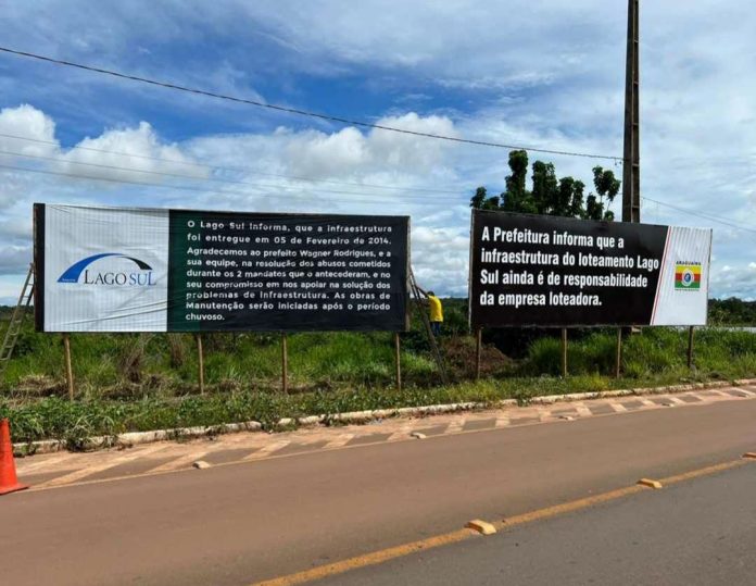 Em uma das placas a prefeitura informa “que a infraestrutura do loteamento Lago Sul ainda é de responsabilidade da empresa loteadora.”