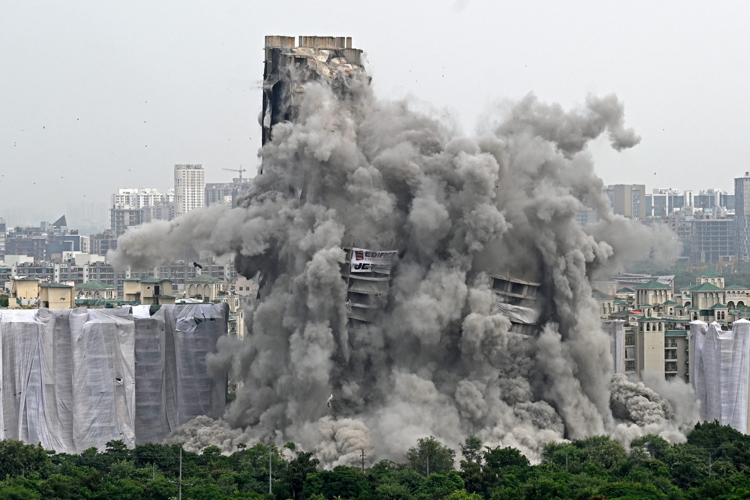 A implosão controlada, graças a 3.500 kg de explosivos, destruiu em poucos segundos as “torres gêmeas” de 100 metros de altura em Noida, a sudeste de Nova Délhi.