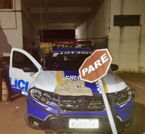Objeto foi levado da esquina da Avenida Ceará com a Rua 13, no centro da cidade, na madrugada desta segunda-feira (24). Placa de Pare foi recuperada pela polícia