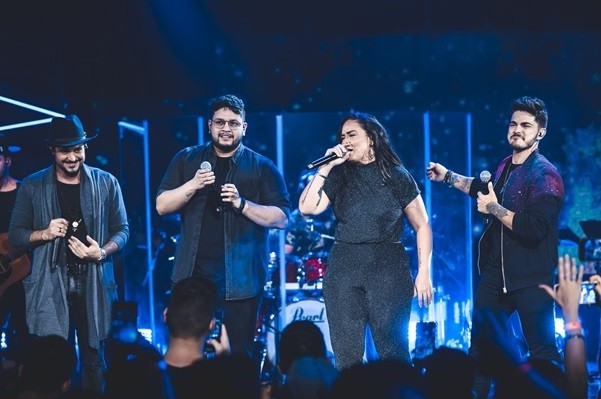 Dupla de Luiza, cantor sertanejo passou mal durante registro de ‘Tô solteiro’. Faixa integra o DVD ‘Não é o Fim do Mundo’. ‘Já chorei tanto pensando nesse dia, que hoje só aceito sorrir’, afirma Luiza. Luiza e Maurílio com a dupla Zé Felipe e Miguel durante gravação de DVD