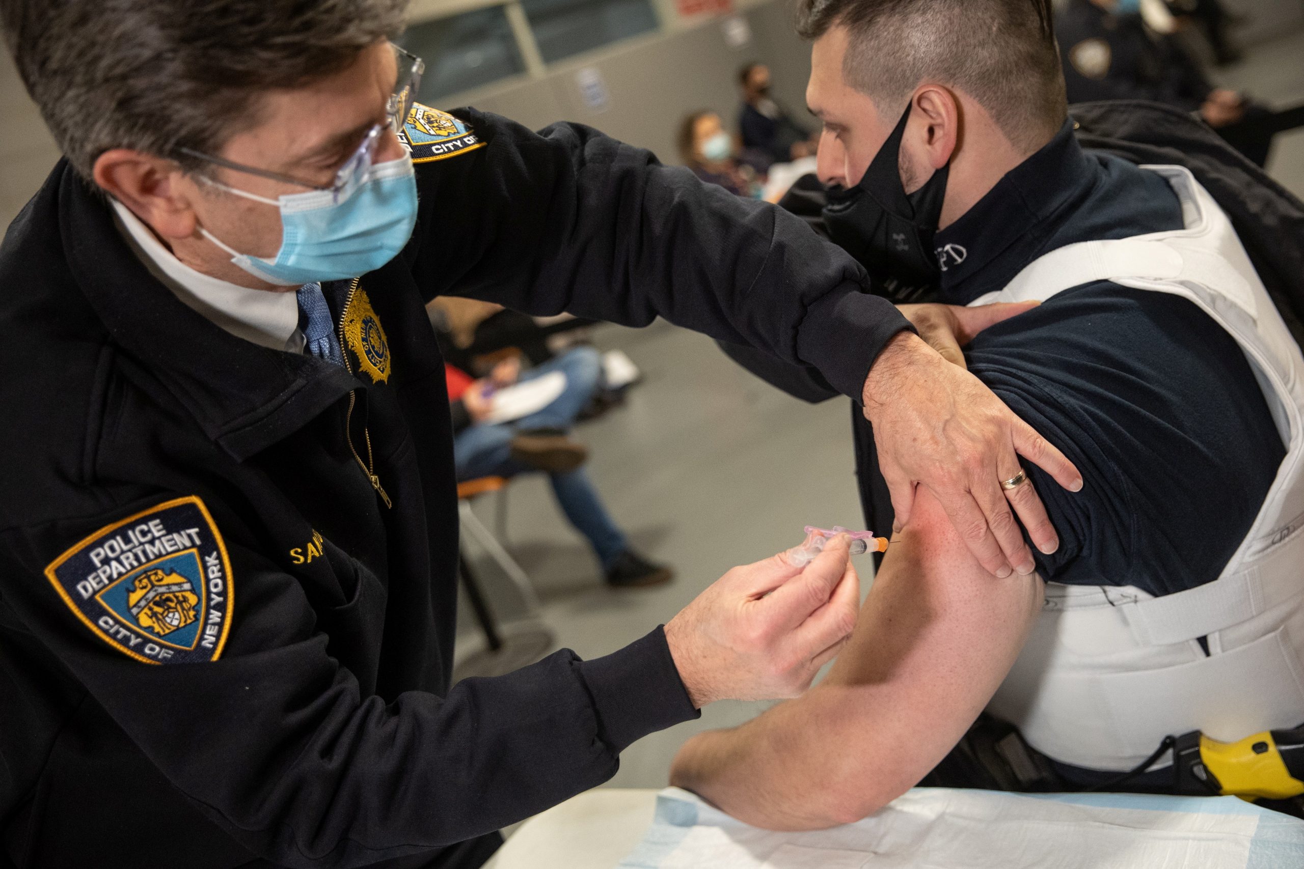Agente do departamento de polícia de Nova York (NYPD) recebe dose da vacina contra a Covid-19 da farmacêutica Moderna Covid-19 na sede da academia da polícia no Queens, no subúrbio de NY, em 11 de janeiro de 2021