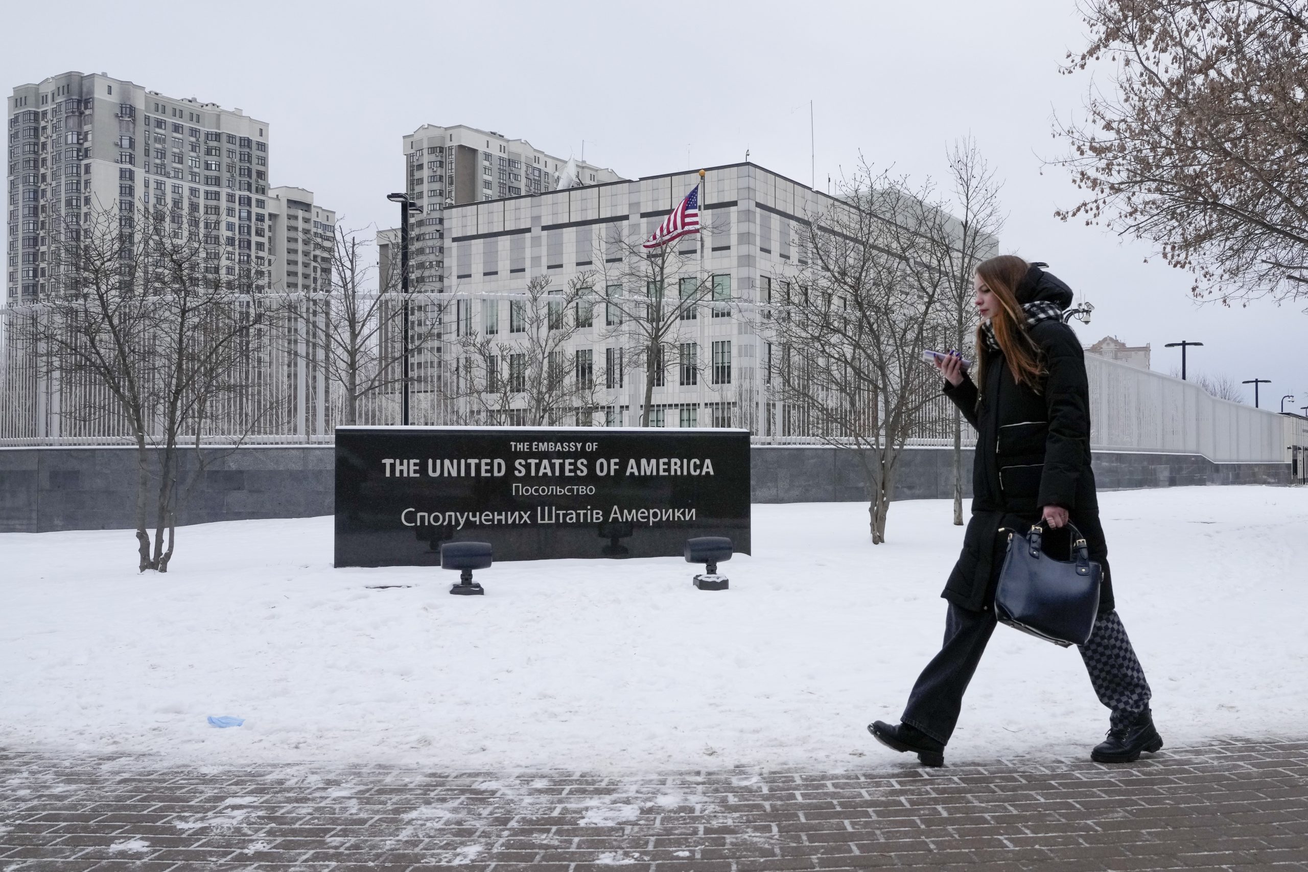 Mulher caminha em frente à embaixada dos Estados Unidos em Kiev, capital da Ucrânia, em 24 de janeiro de 2022