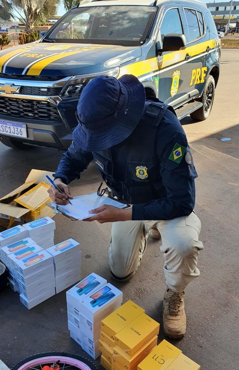 A equipe da PRF fez a vistoria no veículo e encontrou uma mala com diversos aparelhos celulares e uma sacola com capinhas de celulares, carregadores de celular, relógios e películas.