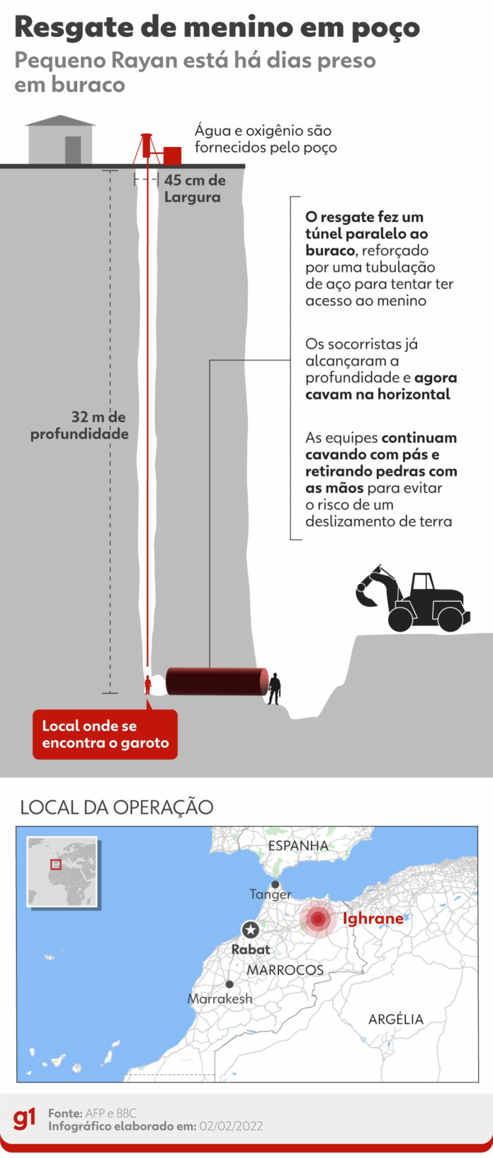 A queda foi na terça-feira (1º), mas o trabalho de resgate começou oficialmente na quarta-feira (2). A operação mobiliza o Marrocos e deixa a população aflita. O pais do menino e centenas de moradores da região se juntaram às equipe esperando pelo fim do resgate.