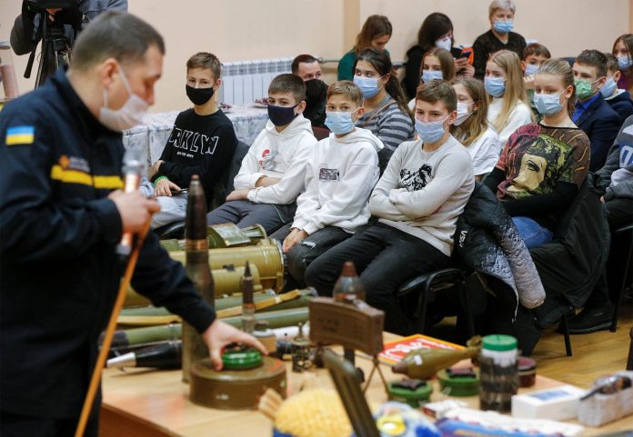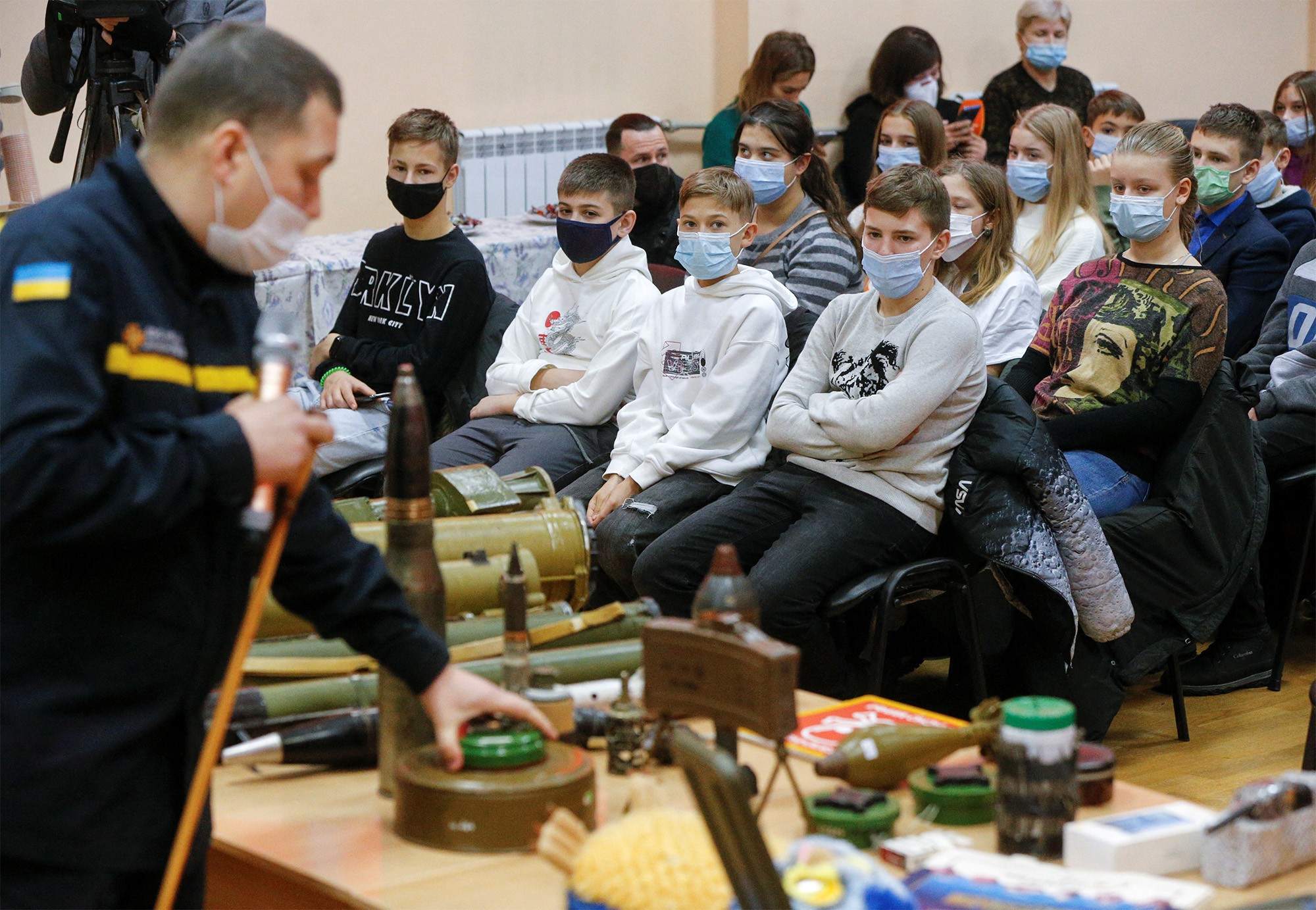Desde o início da semana, diante do risco iminente de bombardeios russos na Ucrânia, escolas preparam seus alunos para o cenário de guerra: entre as aulas de matemática e de geografia, crianças recebem orientações de como reconhecer um explosivo, usar capacete e coletes à prova de balas, escapar de ataques e prestar socorro a vítimas.