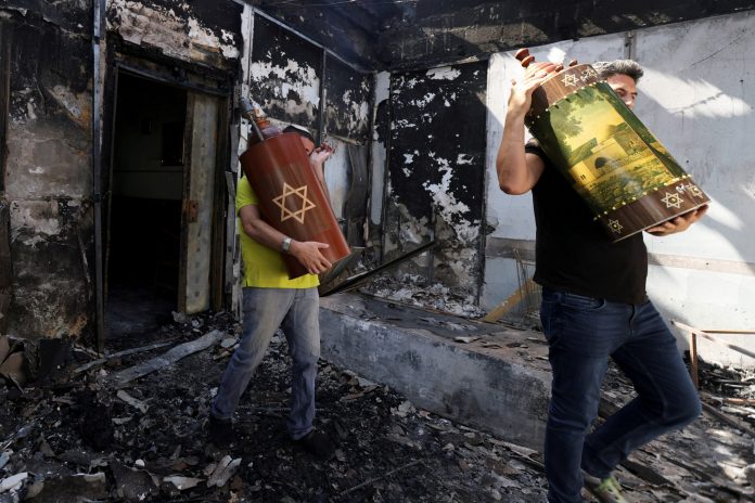 Judeus retiram escrituras de uma sinagoga que foi incendiada na cidade de Lod, em 12 de maio de 2021