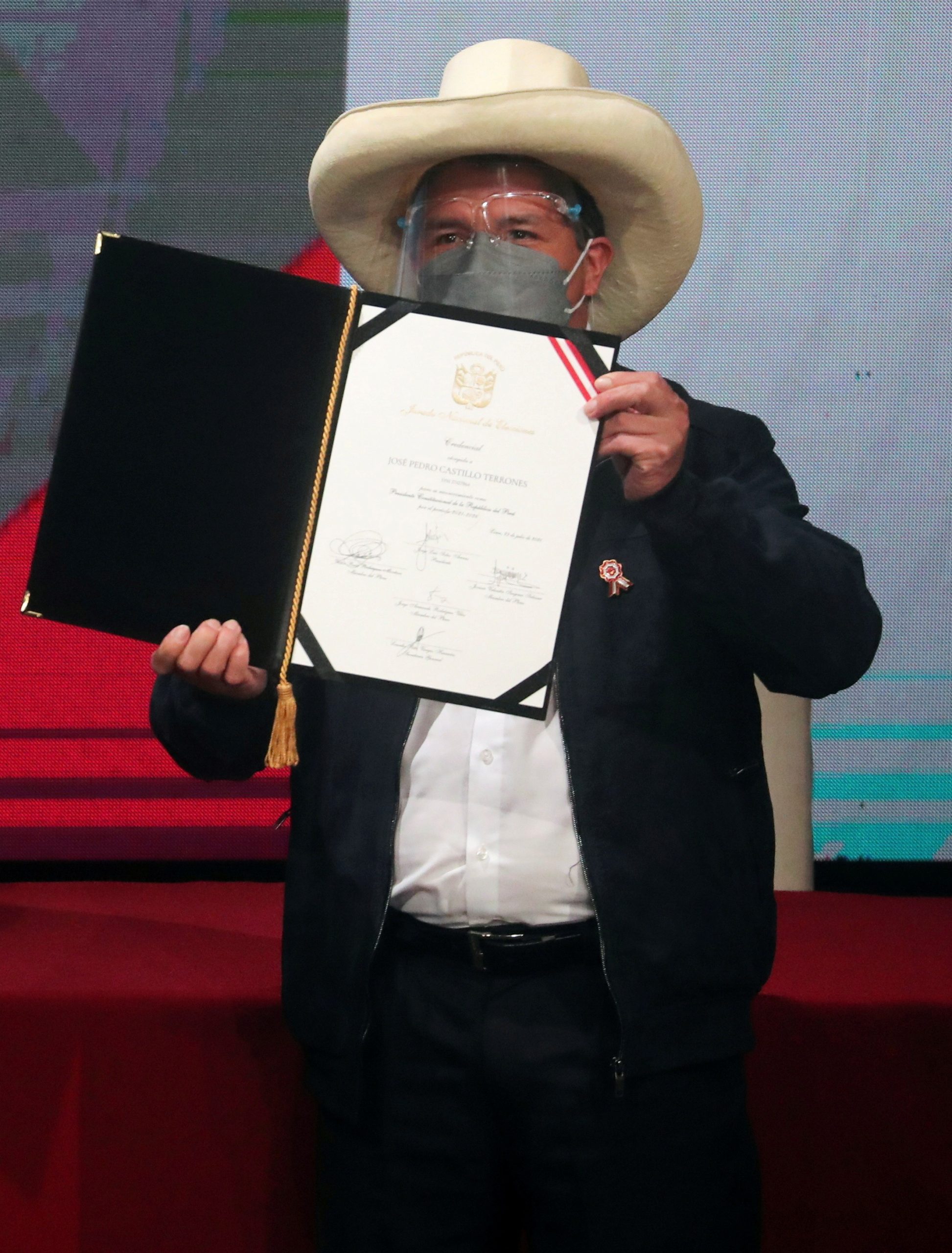 Posso de Pedro Castillo está agendada para a quarta-feira. A oposição conseguiu eleger a nova presidente da Câmara, que é de um partido de centro. Pedro Castillo mostra credencial de presidente assinada em Lima, em 26 de julho de 2021