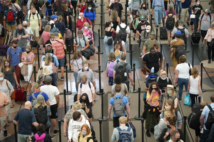Mesmo após pedidos de reciprocidade da UE, que autoriza a entrada de americanos vacinados, os EUA continuam a barrar viajantes oriundos do exterior. Fila de acesso à área de segurança do aeroporto internacional de Denver, nos EUA, em 16 de junho de 2021