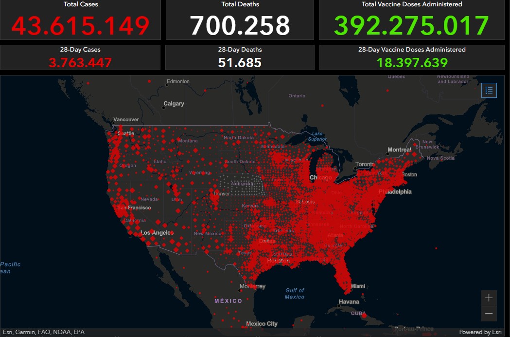 Depois de uma resposta inicial à pandemia muito criticada, os Estados Unidos realizaram campanhas de vacinação eficazes, mas somam 700.258 mortes nesta sexta, o número mais alto do mundo, bem à frente de outros países com altas taxas de mortalidade, como Brasil e Índia.