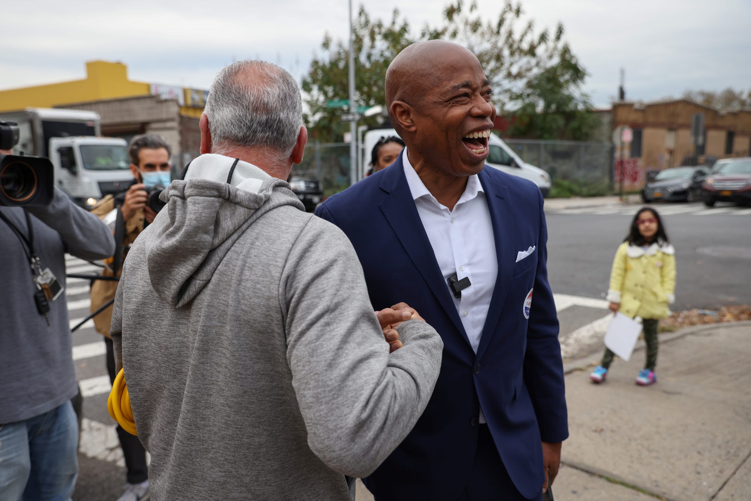 Com um passado de jovem infrator, democrata centrou campanha em melhorar segurança. Ele é o segundo prefeito negro da maior cidade dos Estados Unidos. Eric Adams (direita) cumprimenta apoiadores durante a eleição para prefeito nesta terça (2)