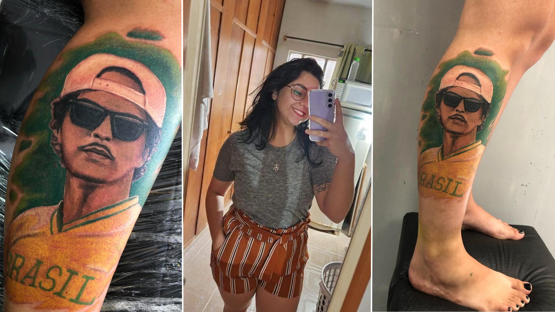 Maria Eduarda Cardoso viu o chamado do tatuador Christian Dualmo para fazer a homenagem, e topou retratar Bruninho em sua mais recente visita ao Brasil. Fã tatua rosto de Bruno Mars na perna e cantor compartilha