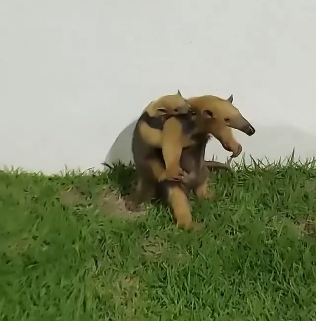 Bombeiros foram chamados para fazer a captura e evitar que os animais corressem risco na área urbana. Fêmea de tamanduá-mirim foi resgatada com filhote