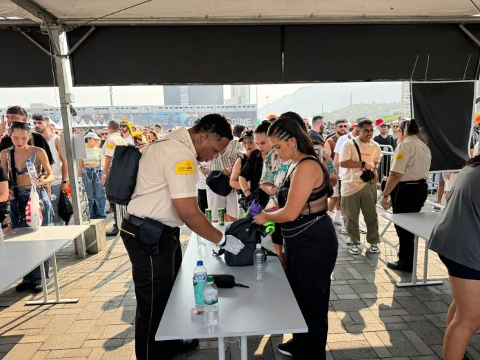 Itens proibidos no festival incluem aerossóis, garrafas de vidro e álcool em gel. Revista na entrada do Rock in Rio.