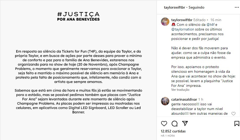 “Por isso, apoiamos o protesto silencioso em homenagem à vida da Ana que vai acontecer no show de hoje: se possível, levem a plaquinha ‘Justice For Ana’ impressa”, diz a postagem do perfil @taylorswiftbr, que tem 189 mil seguidores.