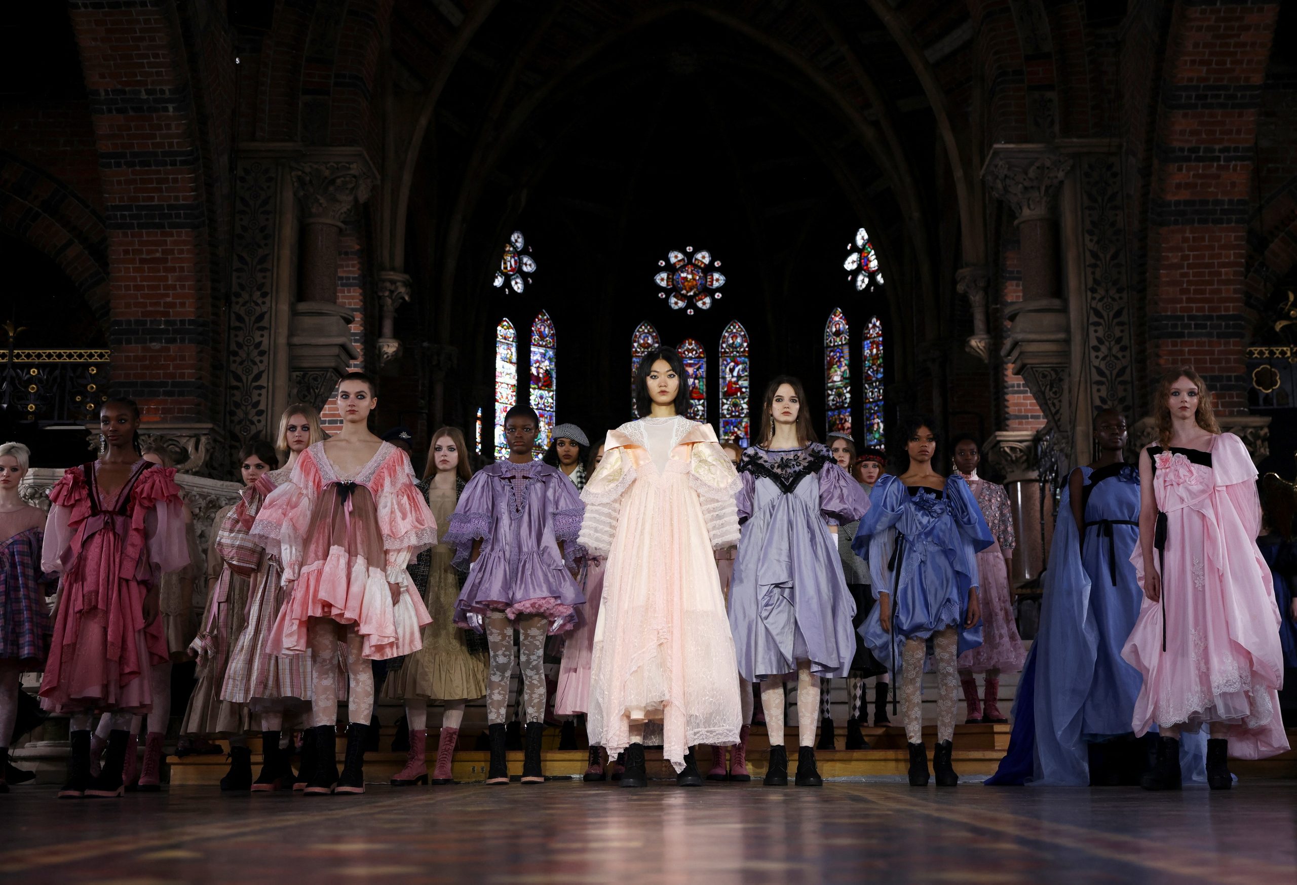 “Parece que séculos diferentes se encontram”, disse Aksu à Reuters. “Existem essas referências do início da Renascença e há muito da vibe dos anos 90 com a maquiagem e o momento grunge e as botas e tudo mais.”