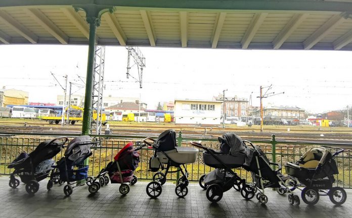 Os carrinhos são doações dos poloneses para ajudar mães da Ucrânia que, com as limitações da fuga, tiveram que abandonar carrinhos dos filhos pequenos pelo caminho.