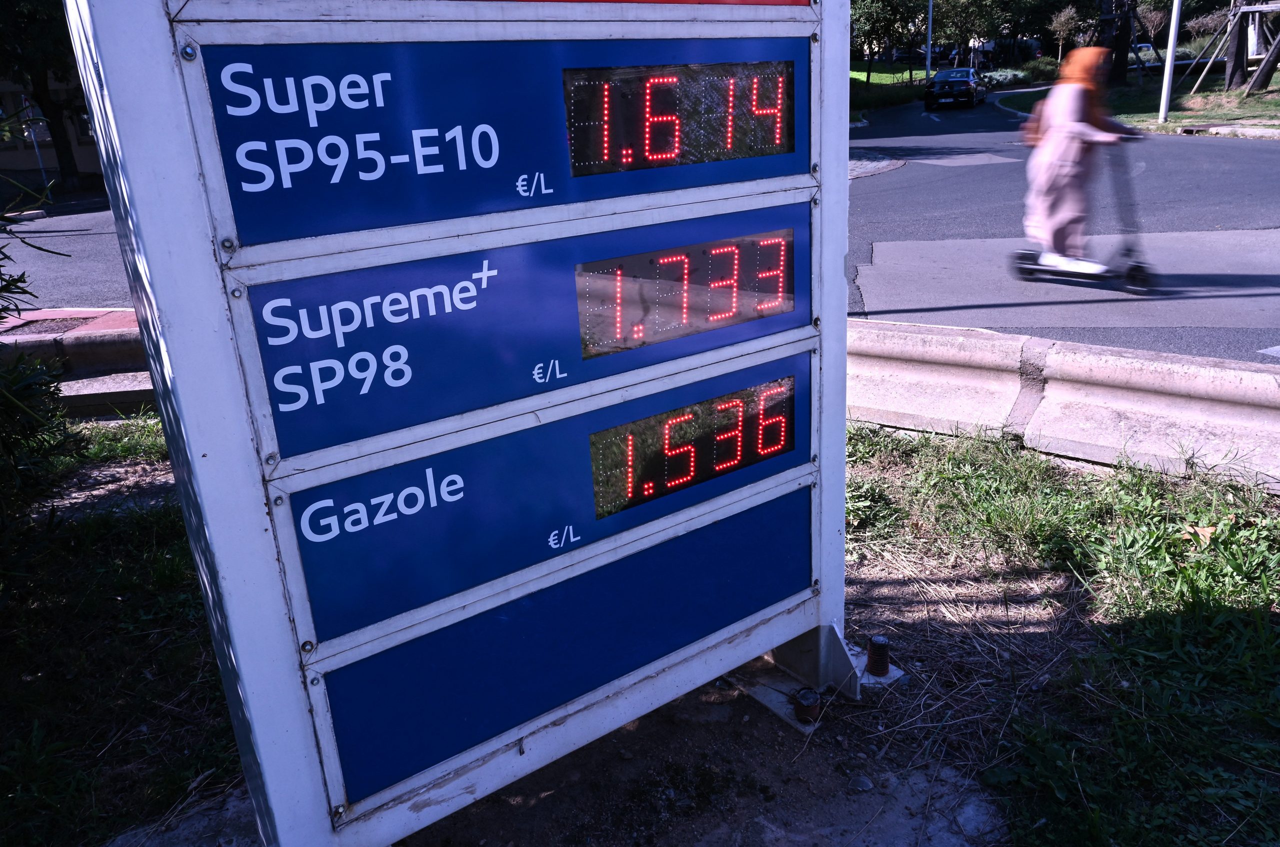 Ajuda será dada para cidadãos que recebem menos de 2 mil euros (R$ 13 mil) mensais. Painel mostra preços de combustíveis na França em 12 de outubro de 2021