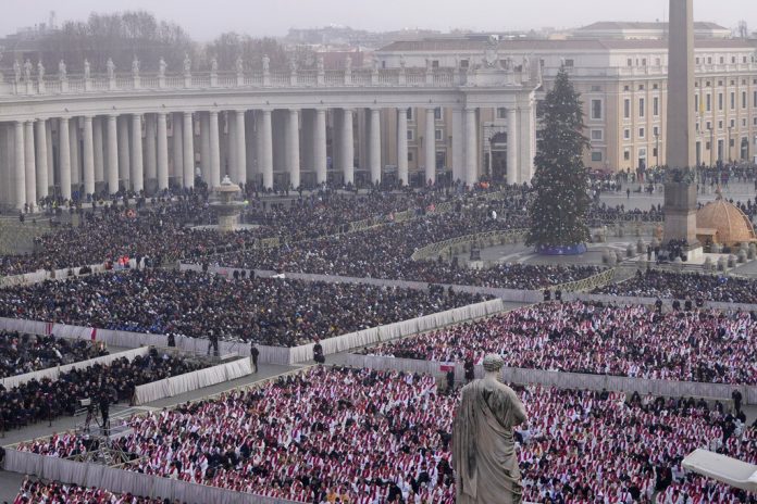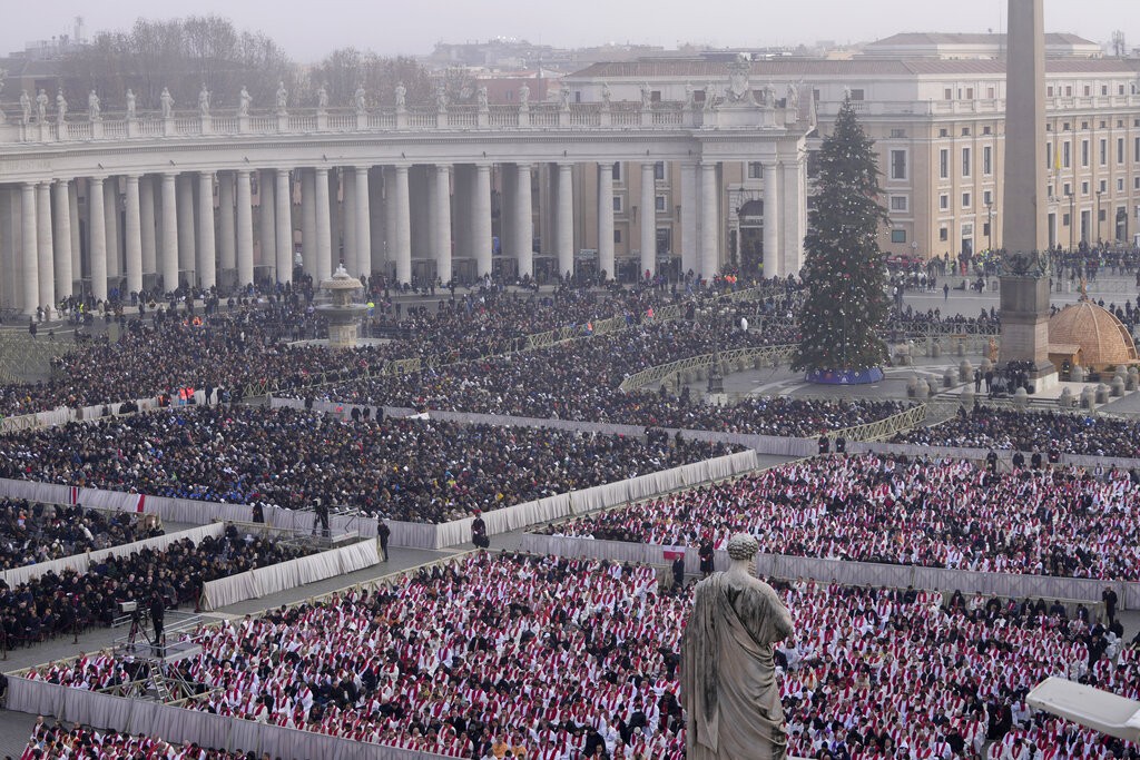 Embora Bento XVI tenha sido mais conservador e menos popular que papas recentes, uma multidão lotou a Praça de São Pedro, no Vaticano, para acompanhar o funeral. Segundo a polícia italiana, mais de 50 mil pessoas participaram do ato, entre membros da igreja católica, fieis, representantes de governos, turistas e jornalistas.