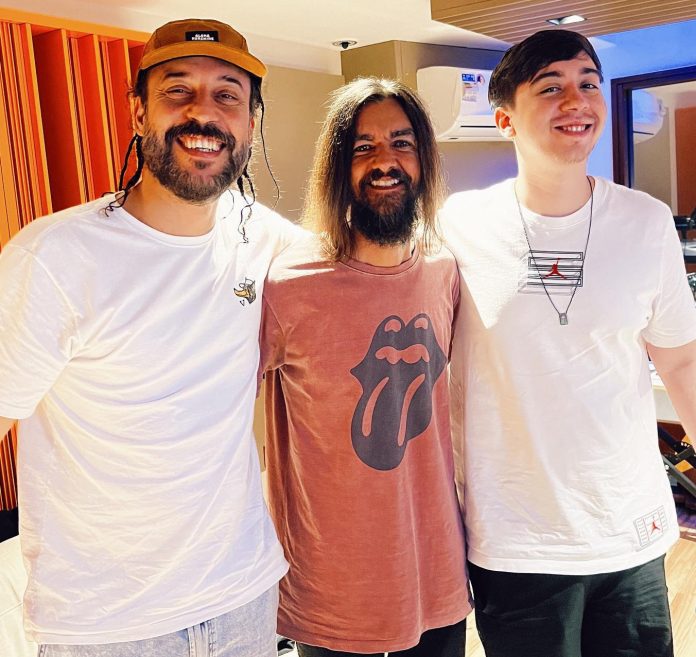 Na foto acima, Gabriel O Pensador posa no estúdio carioca com Armandinho (ao centro) e Kevin.