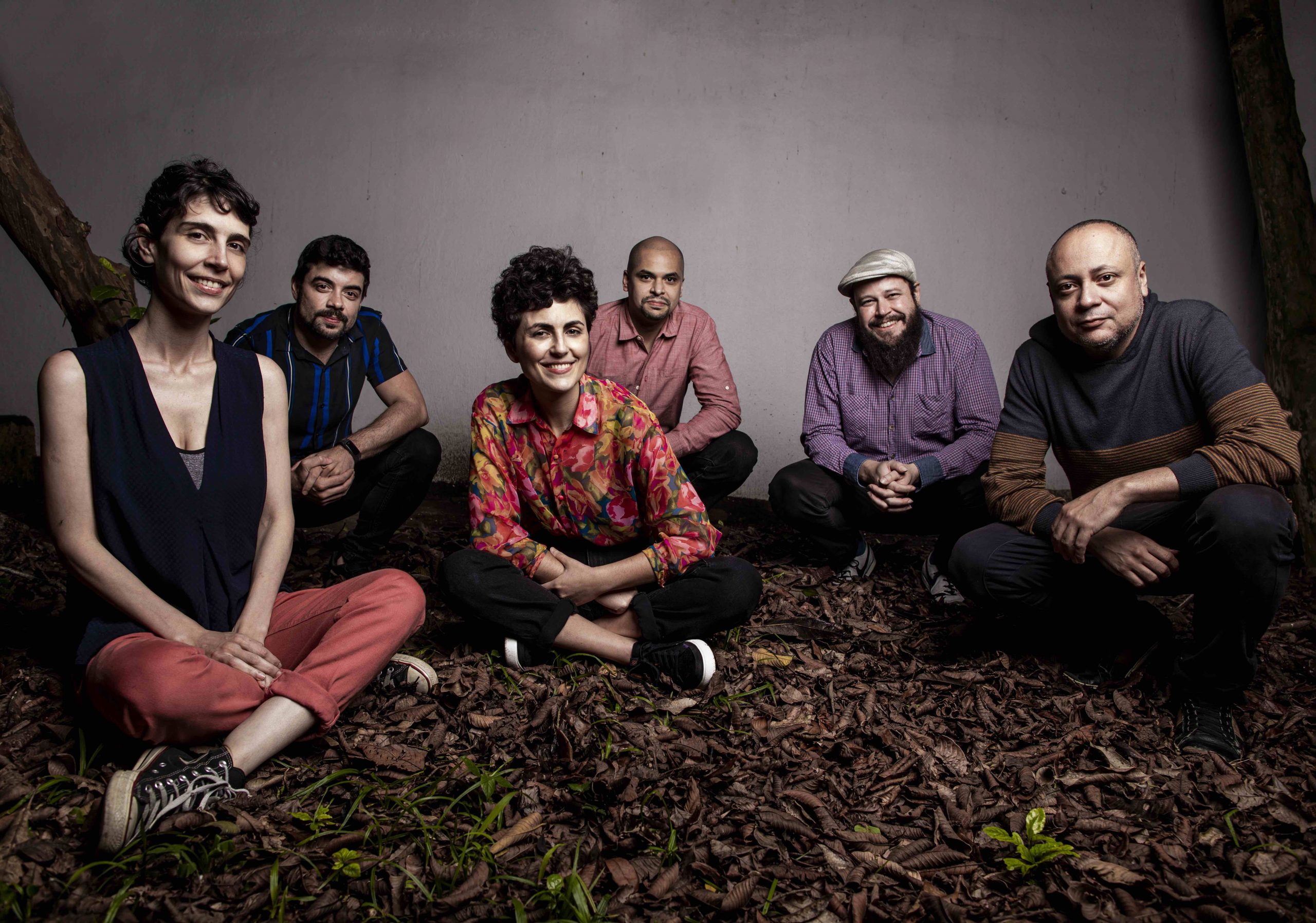 A saxofonista Gaia Wilmer (ao centro, de camisa florida) posa com os músicos do sexteto com o qual gravou o álbum ‘Nosso Carnaval’